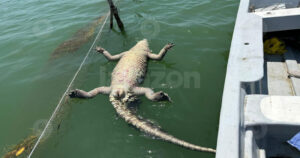 Se trata de un ejemplar que supera los tres metros de largo, el cual quedó atorado en una trampa para camarón