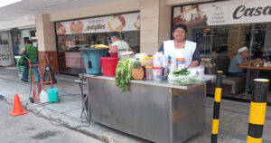 Segunda generación de este negocio, Aracely Reyes ofrece sus jugos de naranja, avena, pollas y ponche en la esquina de la calle Olmos y Altamira