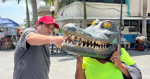 Comerciantes buscan la manera de innovar para ofrecer nuevos productos, tal es el caso como la cabeza de un cocodrilo y ovni, hechos de fibra de vidrio para que la gente pueda tomarse fotografías