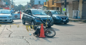 Un motociclista y su acompañante fueron derribados por un carro de ruta, en calles de la zona centro de Madero, la mañana del miércoles. El