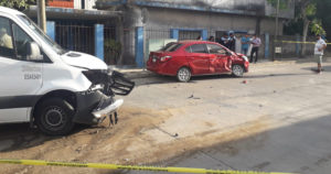 Una Mercedes-Benz de la empresa de paquetería y entregas Estafeta y un Mitsubishi Mirage en color rojo son las unidades involucradas