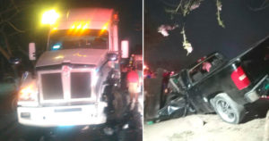 Las unidades involucradas son una Ford Lobo en color negro y un tráiler Kenworth color blanco.
