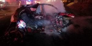 El conductor del vehículo quedó prensado y su cuerpo calcinado por el fuego.
