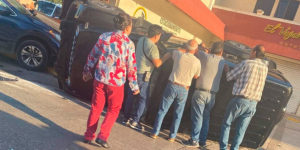 Bomberos del cuartel de la zona centro y personal de Protección Civil, acudieron al sitio del percance para mover la camioneta Jeep en color negro que quedó volcada sobre la calle siete.