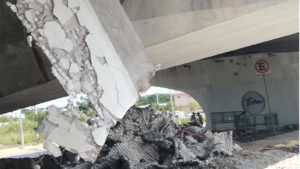 Trabajadores se encargan de quitar la estructura que se colocó como parte de su imagen, la cual resultó dañada por los escurrimientos de agua