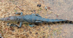 Un cocodrilo fue golpeado con piedras, por atacar a un hombre que lo intentó atrapar
