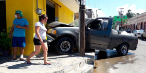Poco faltó para que una camioneta se metiera por completo a una estética, luego de que fuera impactada por un automóvil, en calles de la zona centro de Tampico.