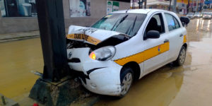El exceso de velocidad y el pavimento mojado con lodo se combinaron para que un vehículo del transporte público se estrellara con el poste de un semáforo, en la avenida Miguel Hidalgo, en Tampico.