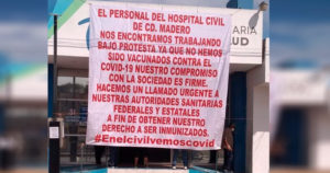 De nueva cuenta colocaron una manta afuera del hospital, en el que hacen un llamado a las autoridades sanitarias, federales y estatales, a fin de obtener el derecho a ser inmunizados