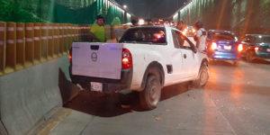 El conductor de una camioneta se estrelló con el muro que sirve como camellón central del paso a desnivel de la calzada San Pedro, resultando dañada la unidad mientras que el sujeto sufrió algunos golpes.