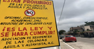 TAMPICO, TAMAULIPAS.- Vecinos de la colonia Águila y Altavista han colocado letreros para advertir que están en contra de la apertura de más negocios en
