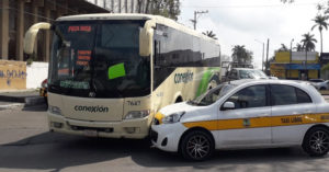 Un autobús foráneo que trataba de incorporarse a la avenida Miguel Hidalgo, fue impactado en un costado por un carro del transporte público, la mañana del viernes.