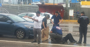 Poco faltó para que fuera arrollado por un auto que frenó a tiempo, cuando se registraba fuerte lluvia.