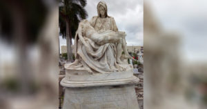 La escultura hecha en una sola pieza de mármol de carrara está al pie de la tumba del periodista Vicente Villasana.