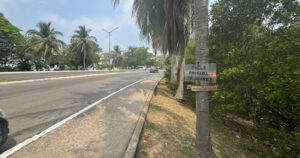 Las palmeras que adornan el perímetro de este cuerpo de agua están siendo utilizadas como improvisadas estructuras publicitarias y de señalización