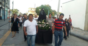 Los feligreses acompañan a la imagen de la Virgen vestida de luto