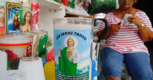 Con estampitas, veladoras y flores, los vendedores apostados afuera de las iglesias también esperan el milagro