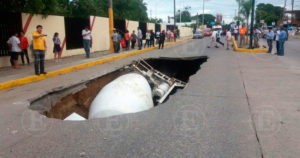 Un camión se hundió la tarde de este viernes cuando se desplazaba sobre la calle 10 en la colonia 20 de Noviembre