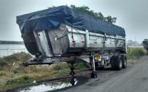 De un enorme góndola escurre una sustancia negra que se acumula en la calle principal que comunica con la colonia La Barra