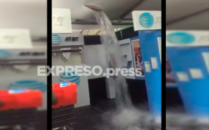 En un video que circula en Facebook, se ve como la intensidad del agua provocó que el techado de lona en zona comercial se reventar