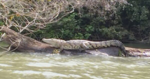 El enorme ejemplar fue sorprendido cuando descansaba en un tronco en un canal de navegación del río