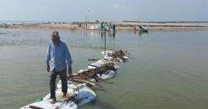 Pescadores del ejido Armenta, siguen con la colocación de costales de arena para evitar que la laguna de las Marismas se vacíe.
