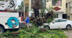 La raíz levantó parte del concreto de la banqueta, mientras que el resto del árbol dañó el cofre y suspensión de la unidad motriz.