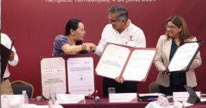 El gobernador Américo Villarreal Anaya y María Luisa Albores González secretaria de Medio Ambiente y Recursos Naturales firman convenio para mejorar calidad del aire en Tamaulipas.