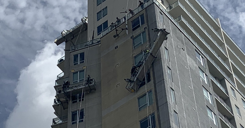 En Houston, bomberos rescataron a dos trabajadores que se quedaron atrapados en una plataforma que colapsó en los últimos pisos de un edificio