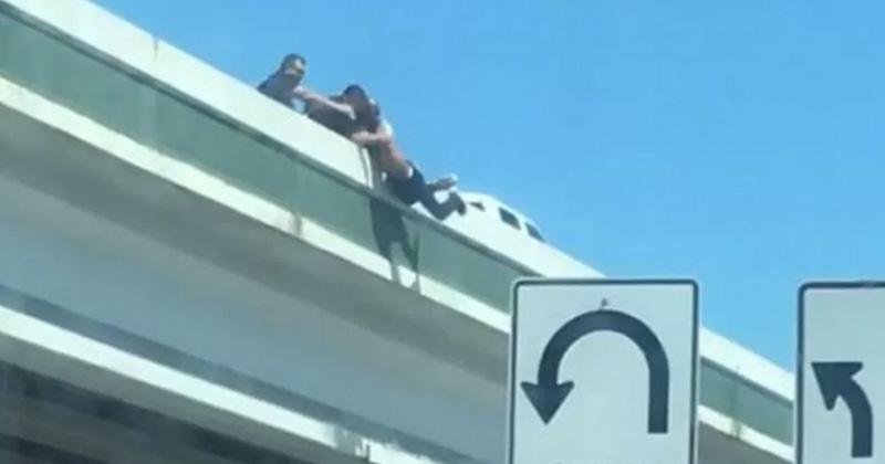 La grabación muestra al hombre colgando sobre el borde de un paso elevado de una autopista en Houston