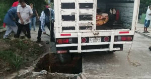 Una camioneta que circulaba por calles de la colonia Pavón terminó protagonizando aparatoso percance al caer enorme socavón, abierto sobre pleno pavimento.