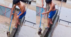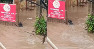 Durante las inundaciones en Poza Rica, Veracruz; un lomito fue captado aferrándose a la vida y no ser arrastrado por las aguas que inundan la colonia en donde vive