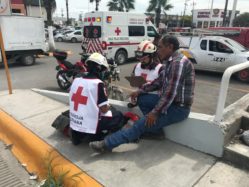 Técnicos en urgencias médicas de la Cruz Roja auxiliaron a un motociclista resultó lesionado en un choque que ocurrió en el Eje Vial y avenida las Américas justo en la entrada a un centro comercial.