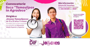 El DIF Tamaulipas lanzó la convocatoria de la beca “Tamaulipas te agradece”, dirigida a jóvenes de entre 15 y 22 años que cursen la preparatoria o universidad.