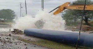 Una excavadora de la empresa que trabaja en la segunda línea, perforó accidentalmente la tubería principal que transporta 900 litros por segundo desde la presa Vicente Guerrero