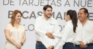 La presidenta del DIF, Mariana Gómez de Cabeza de Vaca y el secretario de la SET, Héctor Escobar Salazar, repartieron estos beneficios: serán 14 mil 817 becas del programa Manutención y mil 605 de “Apoya tu transporte” los que entregarán en la entidad este año