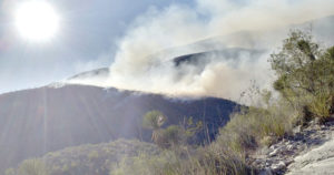 Un cuerpo de 35 brigadistas avanzan por tierra para ayudar a sofocarlo, mientras que por aire un helicóptero bombardea las zonas de fuego con ráfagas de agua con retardante