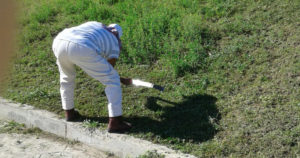 Trabajadores de Servicios Públicos cortan césped con machetes, luego que les retiraron las güiras y podadoras