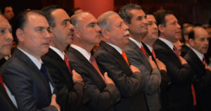 En el recinto se encuentran Gobernadores, Senadores, Diputados Federales, Locales, Presidentes Municipales, y Funcionarios de los diversos órdenes de Gobierno