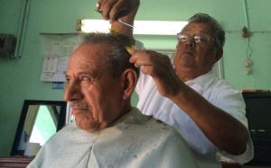 Con 51 años de peluquero, originario de Matlapa, San Luis Potosí, don Marcelo comenzó cobrando un peso, ahora cobra 40, pero ya va a subirle para poder pagar la renta