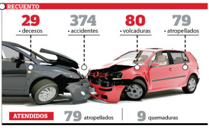 Reportan autoridades de la Cruz Roja que del 12 al 31 de diciembre se han registrado 374 accidentes, donde han fallecido 29 personas; además atendieron a 76 golpeadas