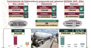 Reportes de la Sedena revelan que en las aduanas de Tamaulipas fueron asegurados casi 4 millones de litros de combustible ilegal entre los meses de enero y abril.